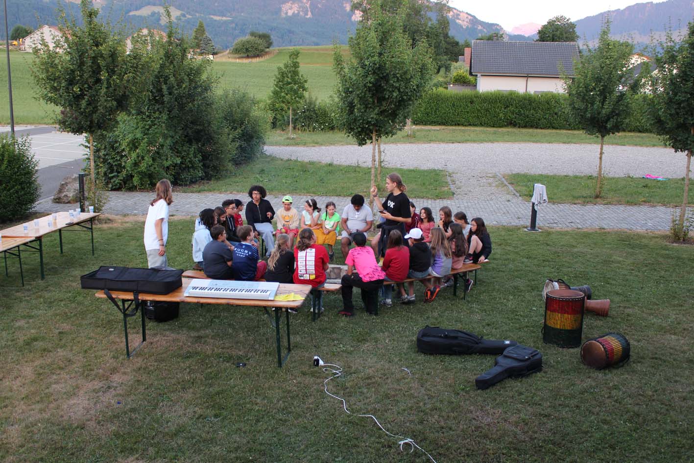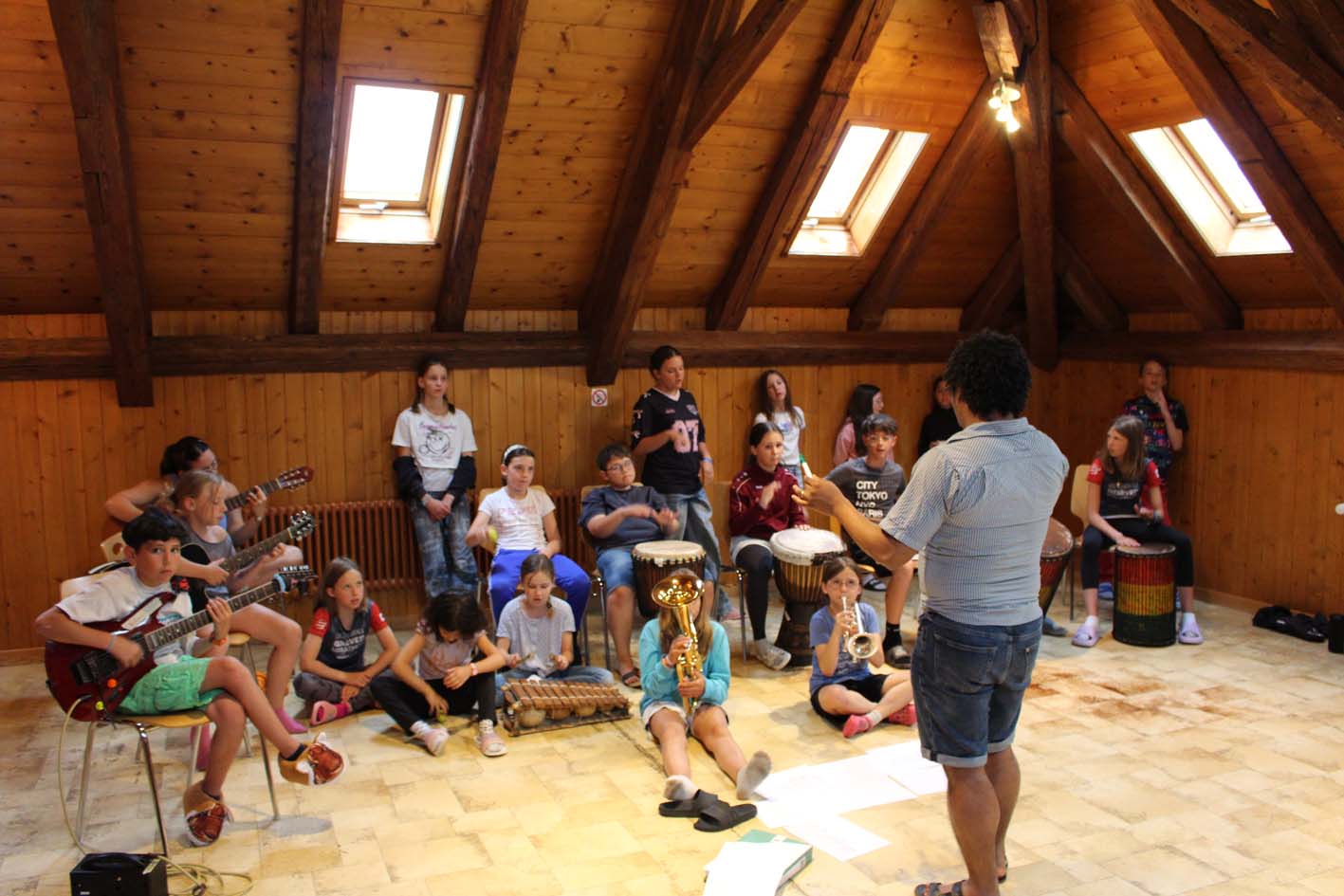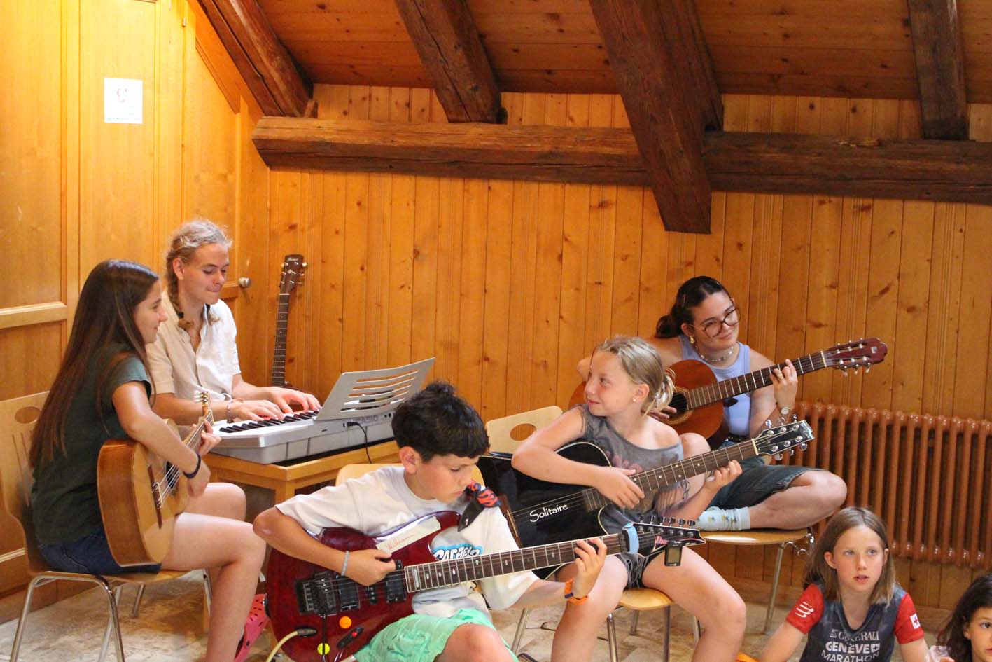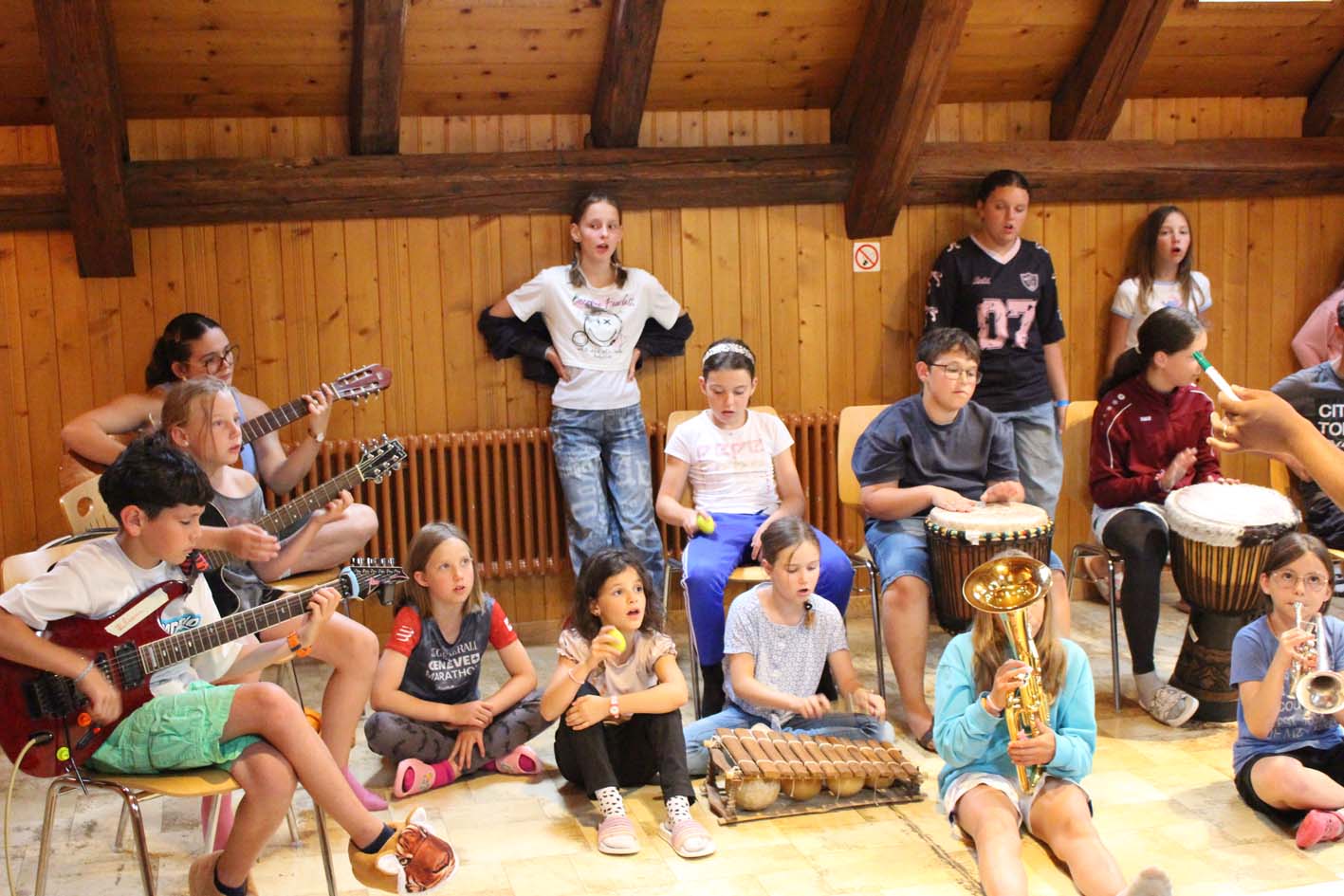 Le camp a merveilleusement démarré ! Les enfants découvrent les instruments, explorent leur musicalité en groupe et partagent de beaux moments entre amis. L’ambiance est joyeuse, rythmée... et gourmande grâce aux délicieux plats de notre chef. Tout le monde va bien, et la musique aussi !